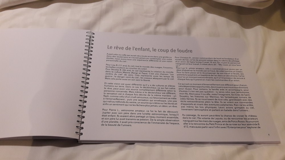 Joli dossier. Qui marque surtout par la qualité de ses photos. Le.a canditat.e a réussi, avec une petite maquette d’avion rouge en carton, et un travail avec du feutre (la matière) à faire surgir divers cieux, et surtout la sensation d’y être, de voler. Belle maîtrise de la lumière. Ce n’est pas seulement technique, l’illusion est là. L’enquête est plus « survolée ». Le.a candidat.e va interroger des pilotes. Il y a peut-être trop de respect de la parole livrée. Le résultat est un peu sage.